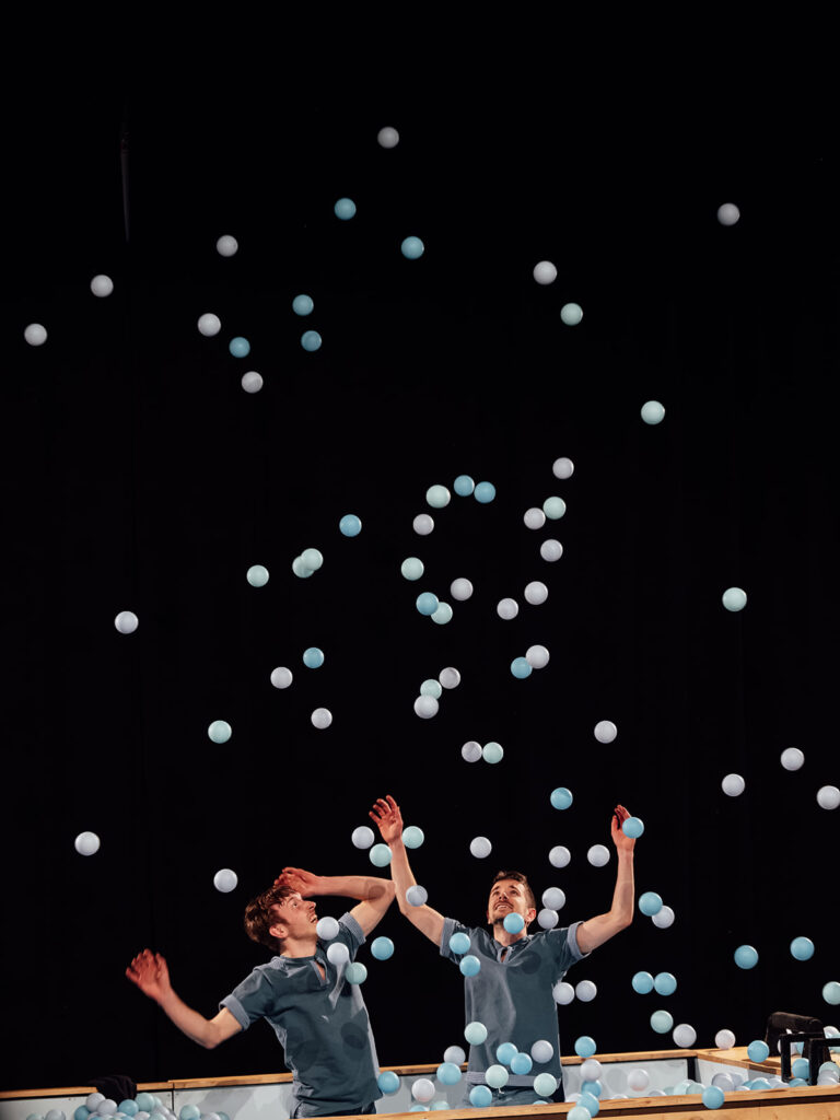 With Splash, Jam.Shenanigans aims to share their love for comically absurd circus with the public. Splash invites the audience on an adventure towards an absurd dream world far away from everyday reality, where a swimming pool (the stage) filled with 25,000 balls stands at the center, and where water sports form the starting point for a juggling feast.